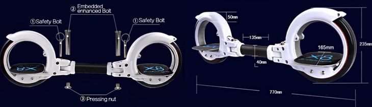 Колелата осигуряват достатъчно пространство за стъпала с всякакъв размер. Това е важно в случай на падане – по-лесно е да изскочите безопасно от скейта, преди да се ударите. Скоростта на скейтсайкъла, благодарение на девет-инчовите колела, може значително да надвиши тази на уейвборда и скейтборда при спускане от хълм – това трябва да се има предвид.