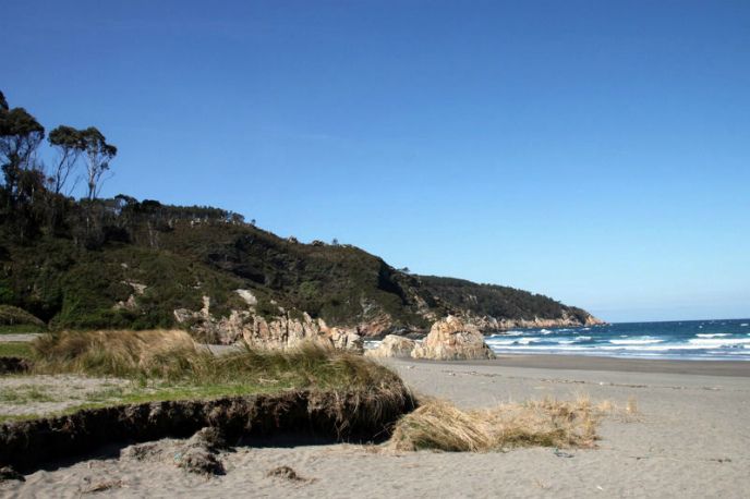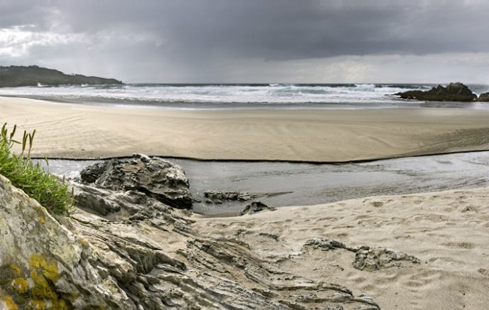 در ساحل، در دو سوی دهانه رودخانه، دو ساحل بادخیز با موجهای قوی و شنهای سیاه قرار دارند.